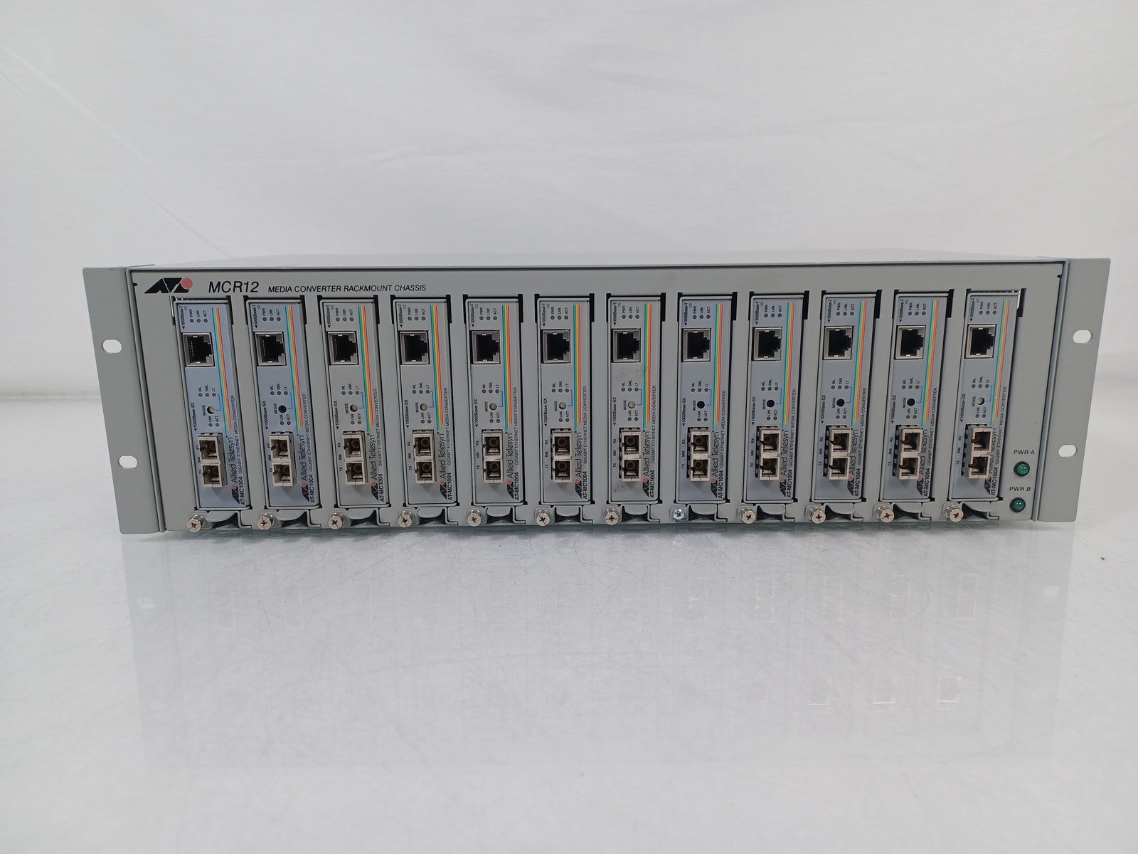 This Allied Telesyn AT-MCR12 12 Slot Power Distribution Chassis With 12 AT-MC1004 Gigabit Ethernet Media Converters has been been tested to power on only, but no further as we are unable to do so in our workshop environment.
