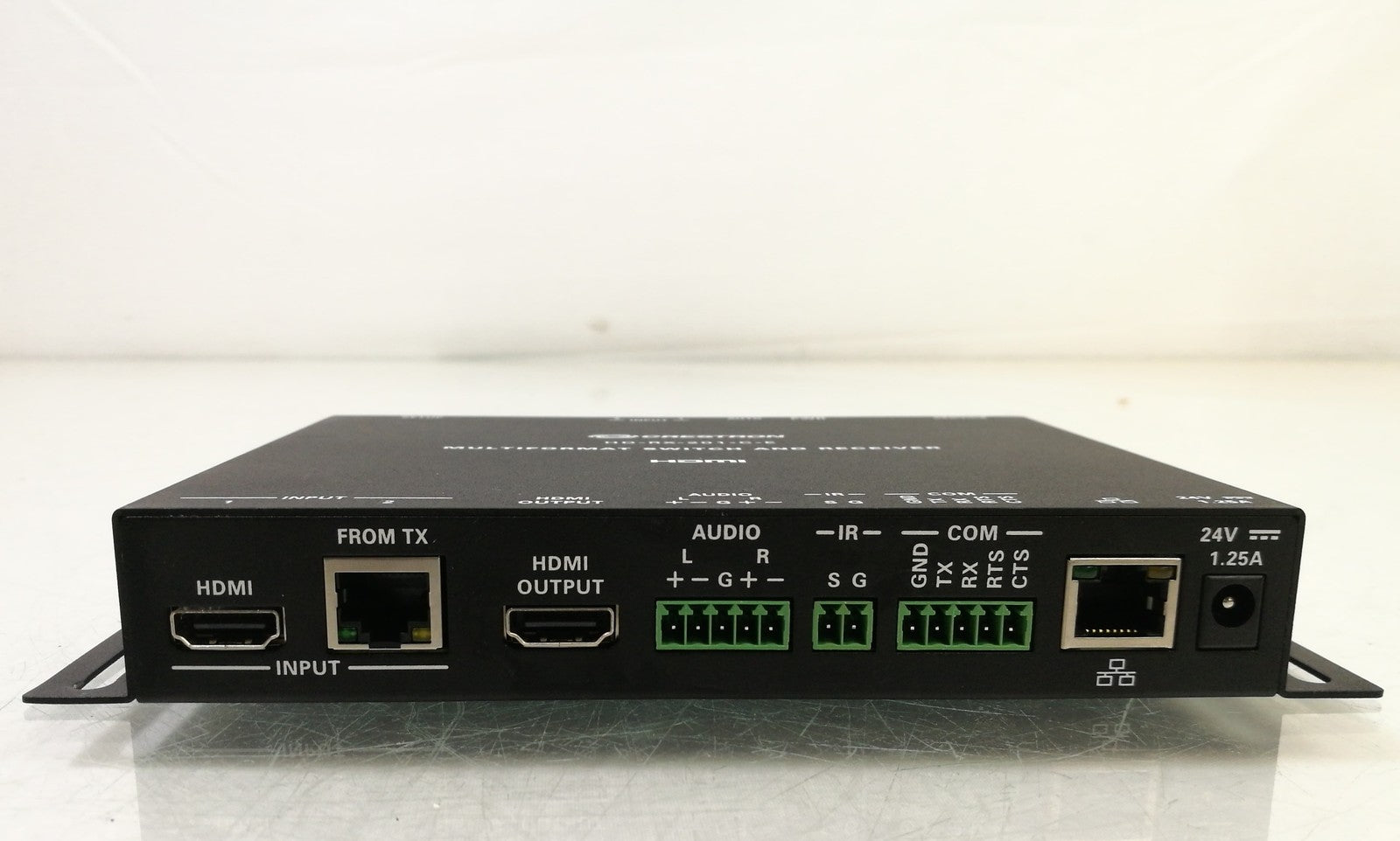 The HD-RX-201-C-E is a surface-mountable DM Lite receiver designed to pair with a DM Lite transmitter to form a point-to-point signal extender for HDMI® signals. It features a built-in HD video scaler and handles video resolutions up to HD 1080p and WUXGA.