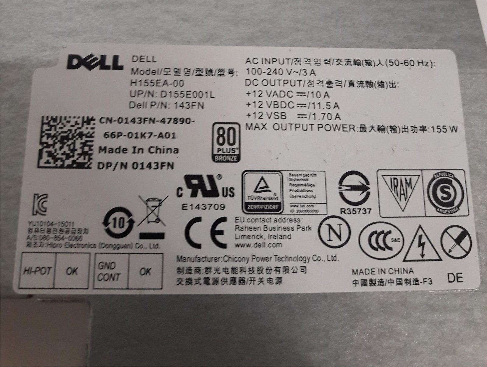 Dell Optiplex 7440 155 W Power Supply Unit 0143FN 143FN H155EA-00