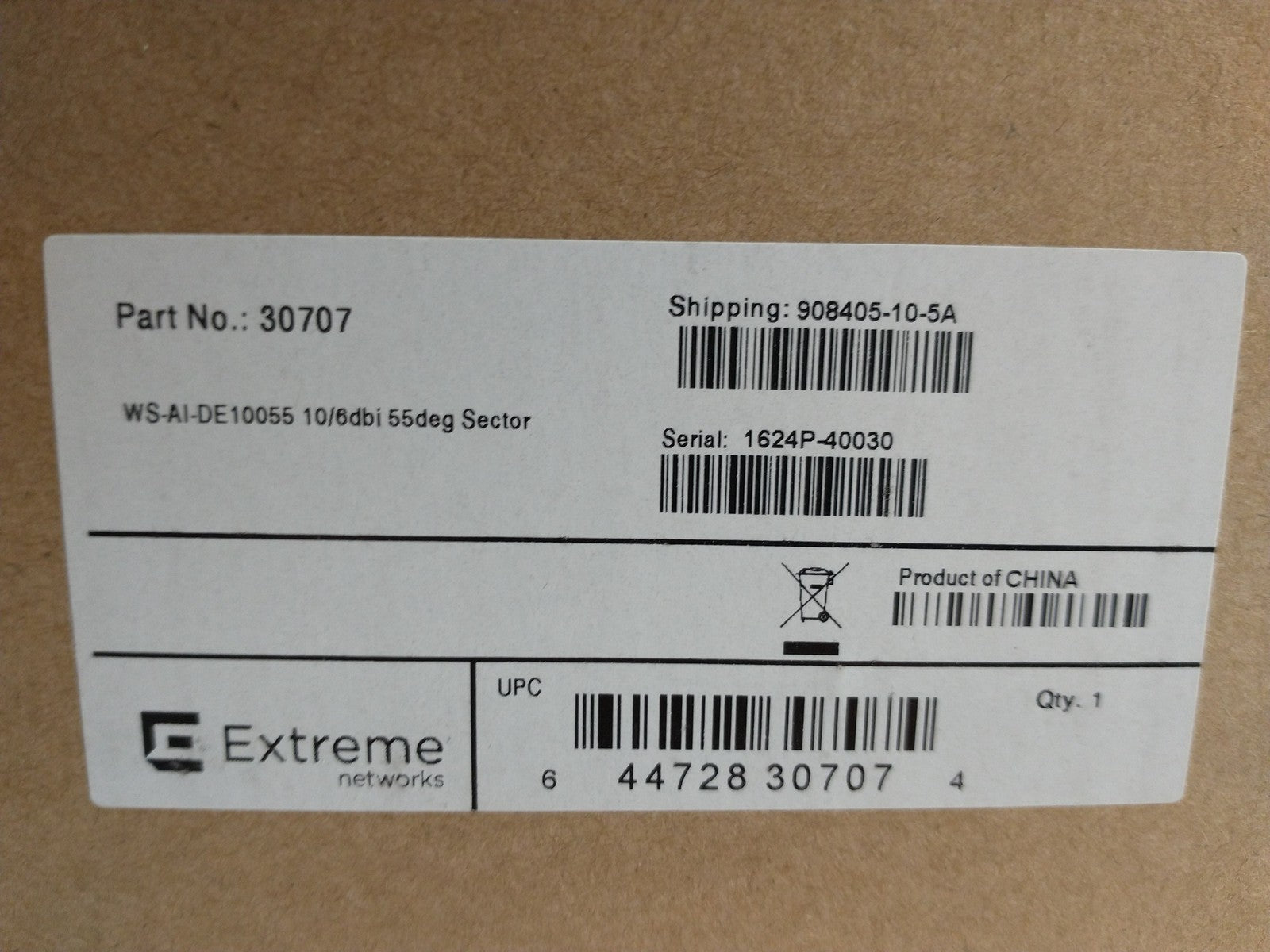 This Extreme Networks WS-AI-DE10055 802.11ax 2.4/5GHz Eight Feed 55 Degree Sector Antenna is new in box