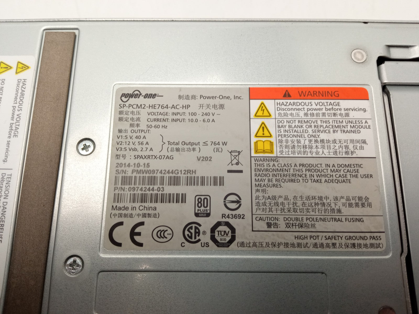 HP 726237-001 764W Server Power Supply Unit Power One SP-PCM2-HE764-AC-HP