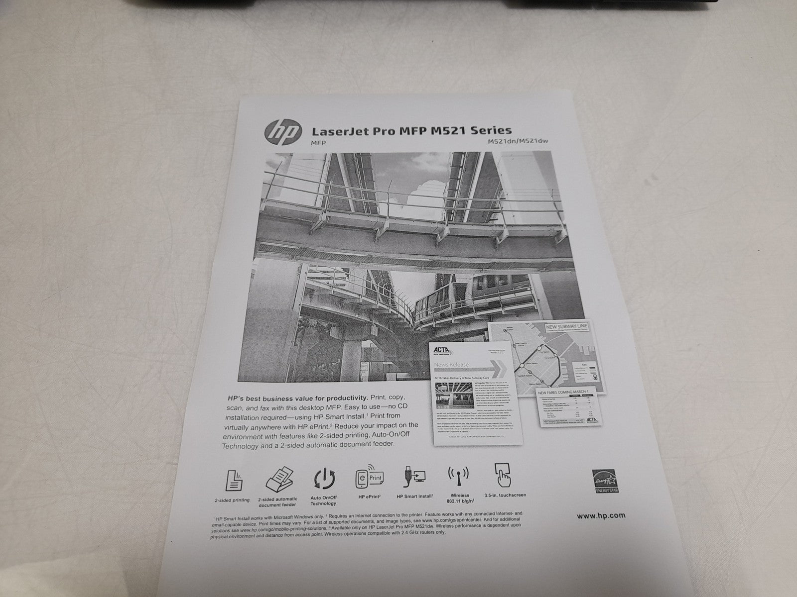 The HP LaserJet Pro MFP M521dw 42ppm A4 mono multifunction laser printer finishes jobs faster, produces high-quality documents, and makes scanning and sharing simple. Get set up and connected quickly. Send quick commands from an intuitive colour touchscreen.