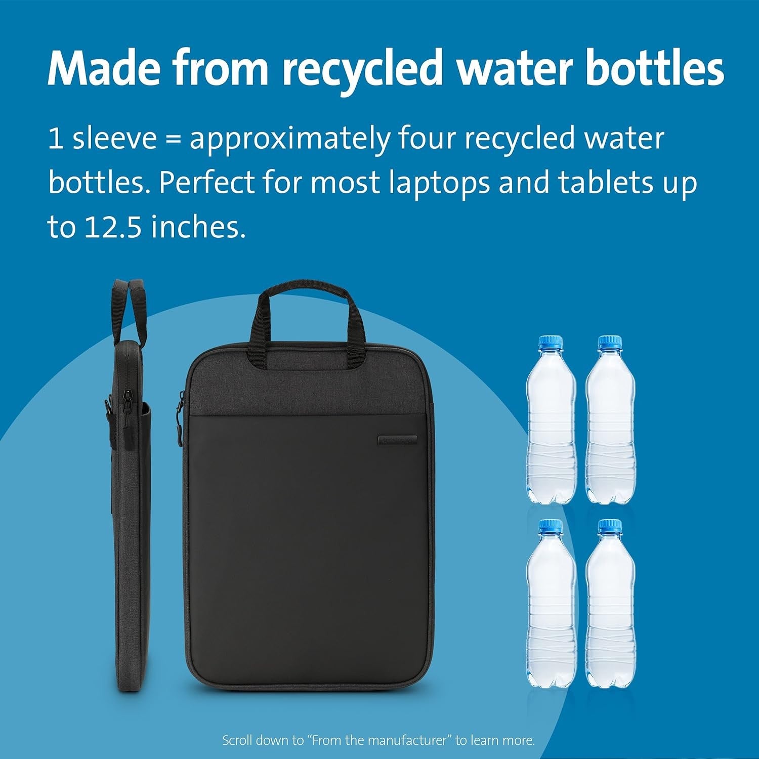Made from recycled water bottles, the 12" Eco-Mindful Laptop Sleeve carrying case not only helps protect laptops and tablets from scratches, bumps, and drops, it helps protect the planet. Perfect for most laptops and tablets up to 12.5 inches (see product specifications for sleeve dimensions). Exterior storage pockets keep accessories and adapters stowed and protected when not in use while helping to avoid accidentally scratching or damaging the laptop. Adjustable shoulder strap and integrated handle offer multiple carry options. Premium zippers and stitching are built to last. Integrated ID holder, great for students and professionals alike.