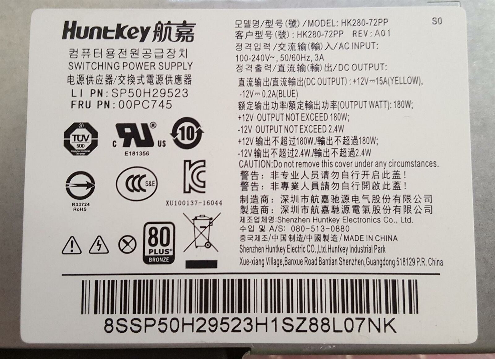 Lenovo HuntKey 180W Power Supply Unit HK280-72PP 00PC745