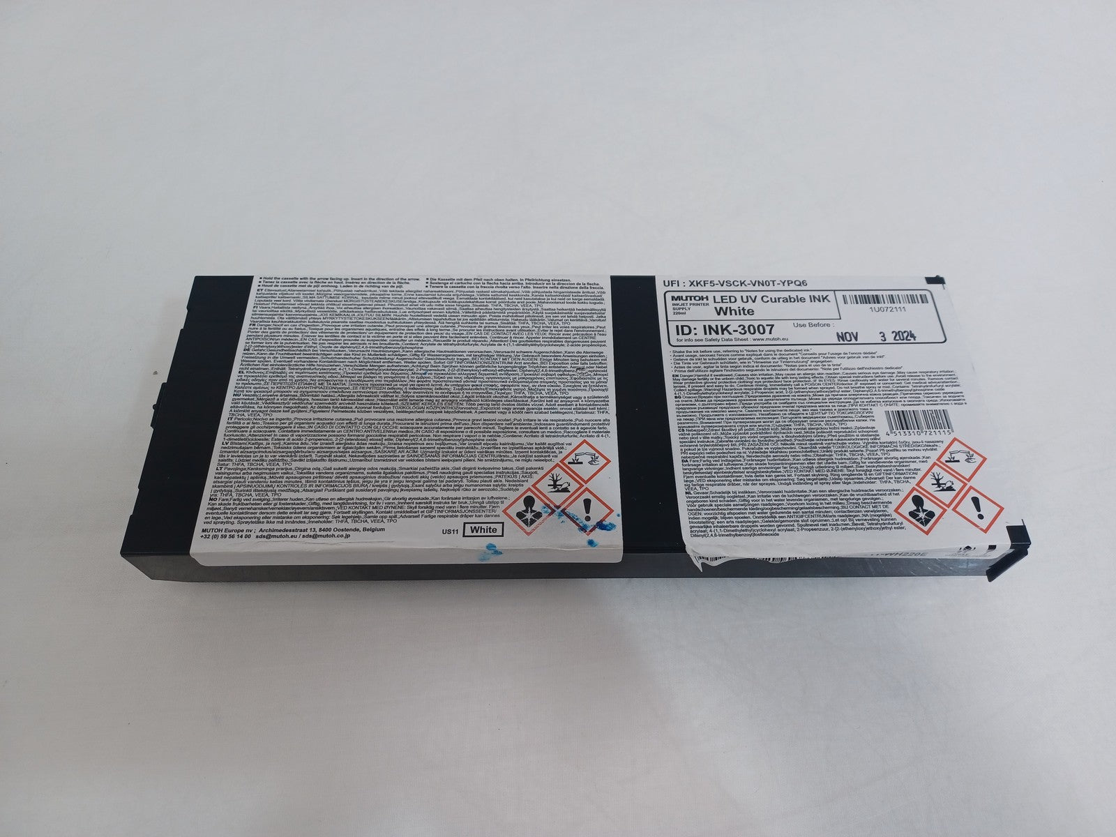 This Mutoh US11-WH220E LED UV Curable Ink 220ml White is new.